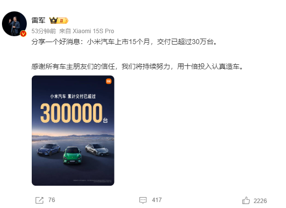 雷军最新发声,称小米汽车上市15个月官网股票配资,交付已超过30万辆。